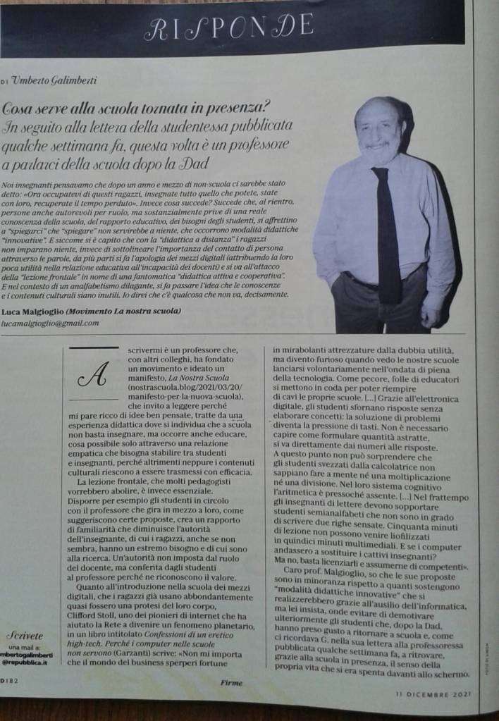 *** Risposta del Professor Umberto Galimberti A scrivermi è un professore che, con altri colleghi, ha fondato un movimento e ideato un manifesto, La Nostra Scuola (https://nostrascuola.blog/2021/03/20/manifesto-per-la-nuova-scuola/), che invito a leggere perché mi pare ricco di idee ben pensate, tratte da un’esperienza didattica dove si individua che a scuola non basta insegnare ma occorre anche educare, cosa possibile solo attraverso una relazione empatica che bisogna stabilire tra studenti e insegnanti, perché altrimenti neppure i contenuti culturali riescono essere trasmessi con efficacia.